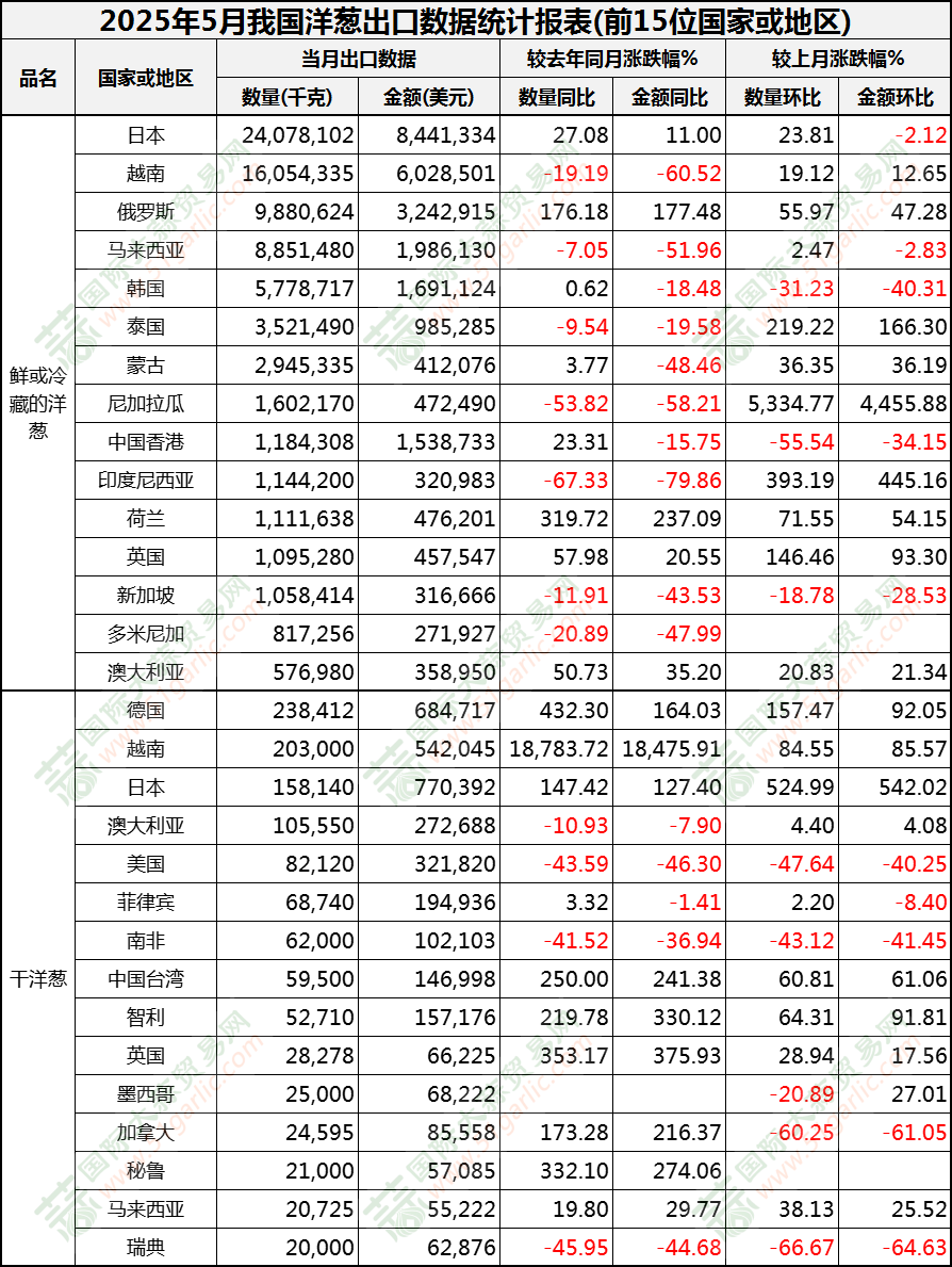 2025年5月洋蔥出口數(shù)據(jù)(按國家)