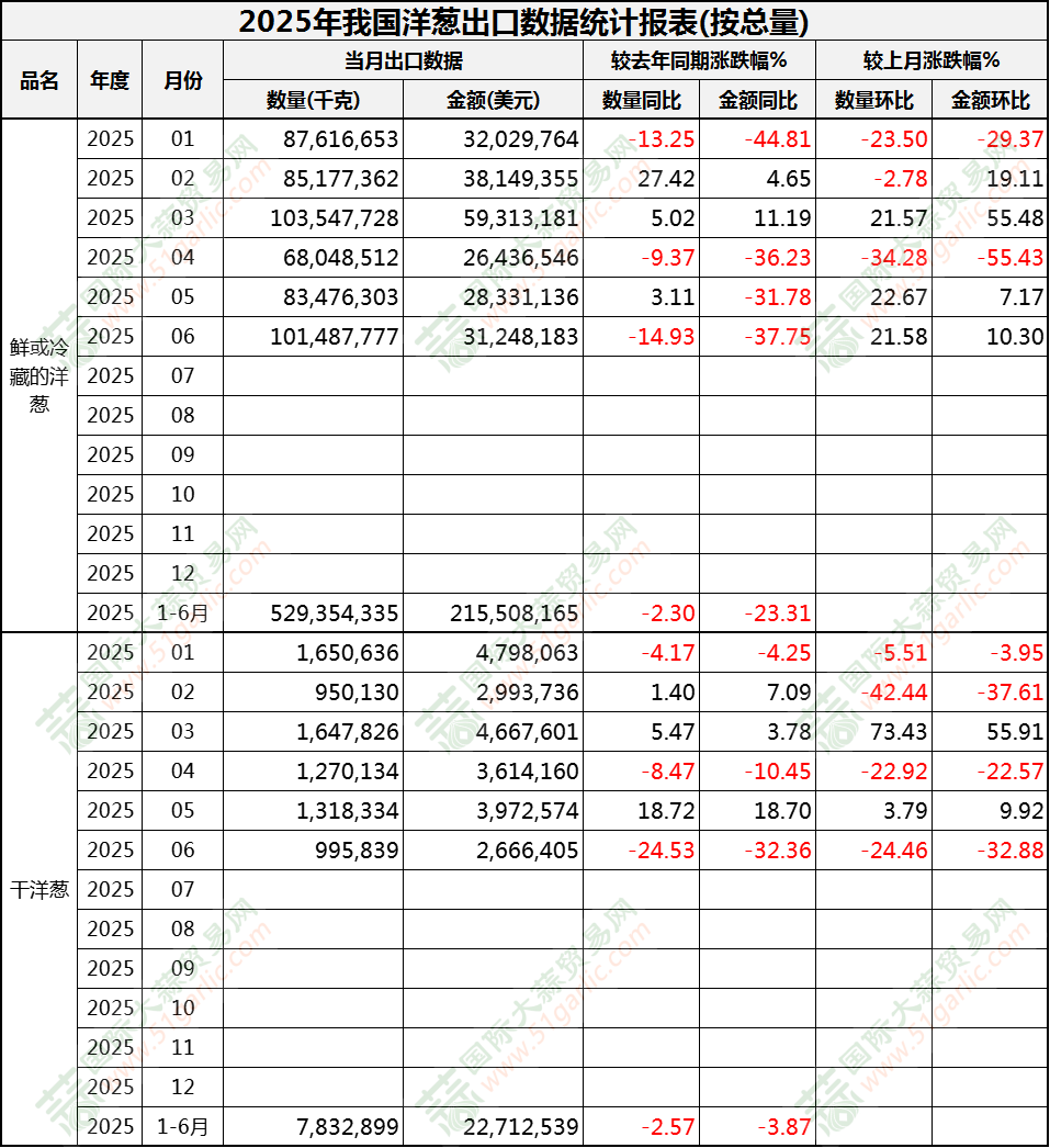 2025年6月洋蔥出口數(shù)據(jù)(按總量)