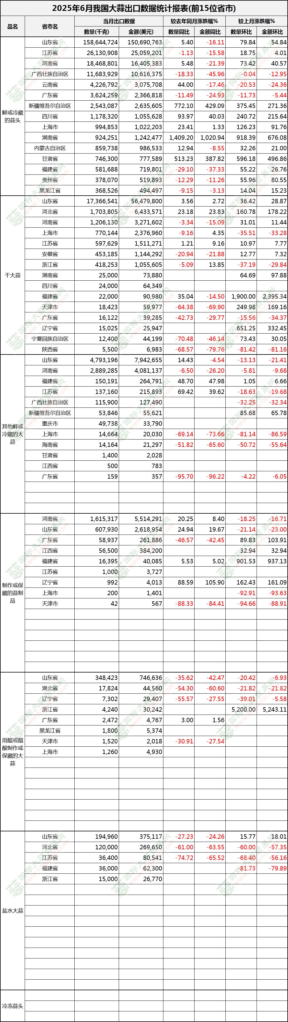 2025年6月大蒜出口數(shù)據(jù)(按省市)