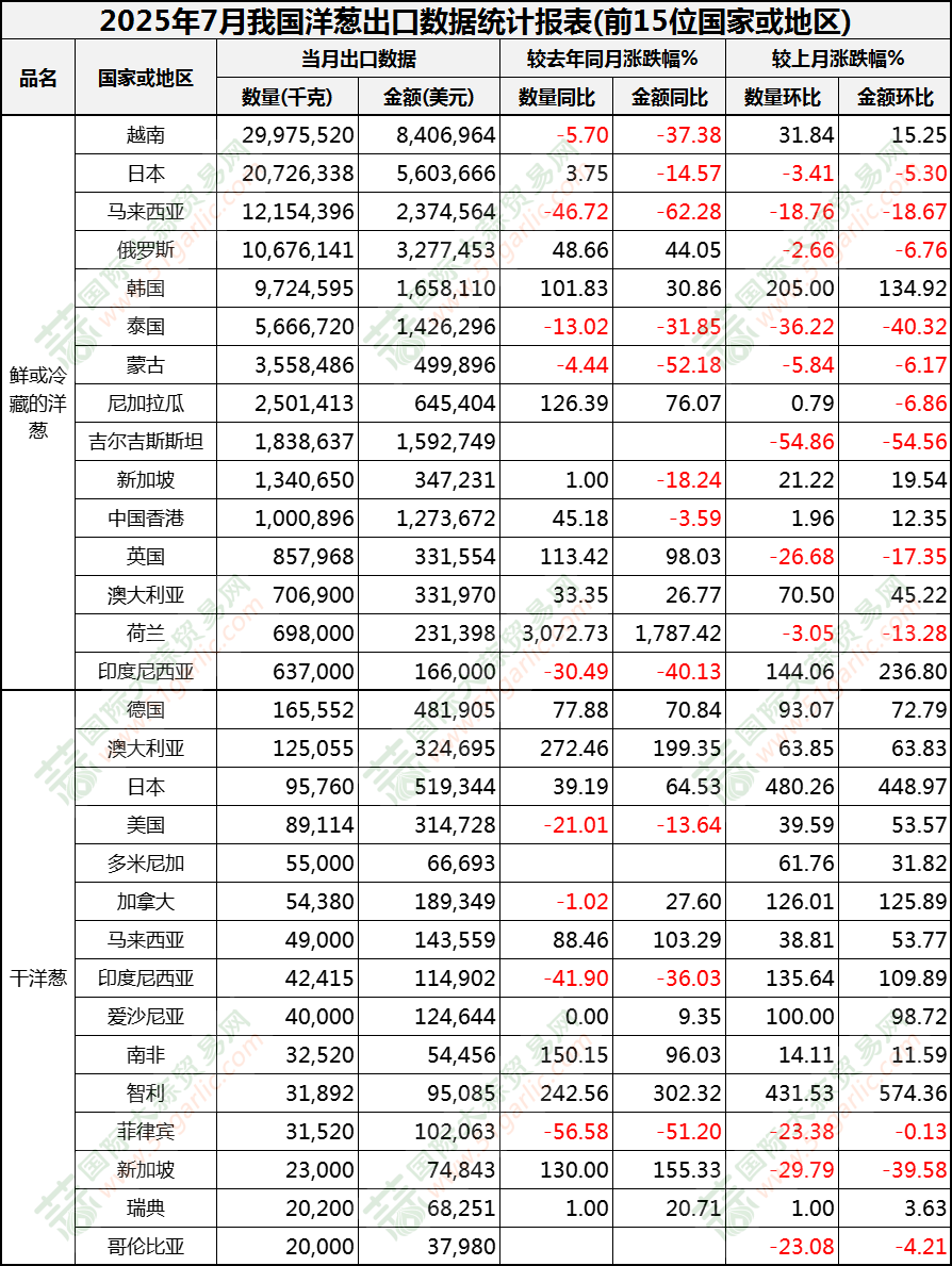2025年7月洋蔥出口數(shù)據(jù)(按國家)
