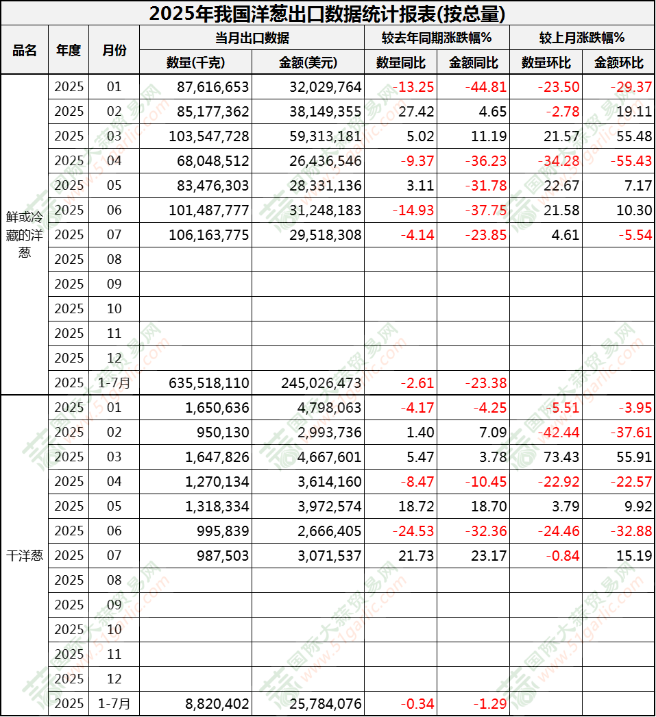 2025年7月洋蔥出口數(shù)據(jù)(按總量)