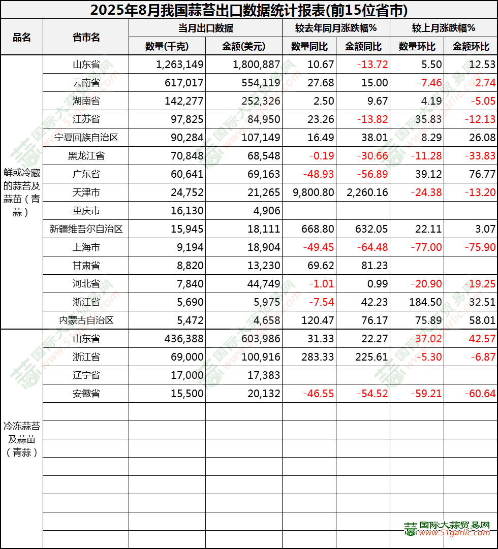 2025年8月蒜苔出口數(shù)據(jù)(按省市)