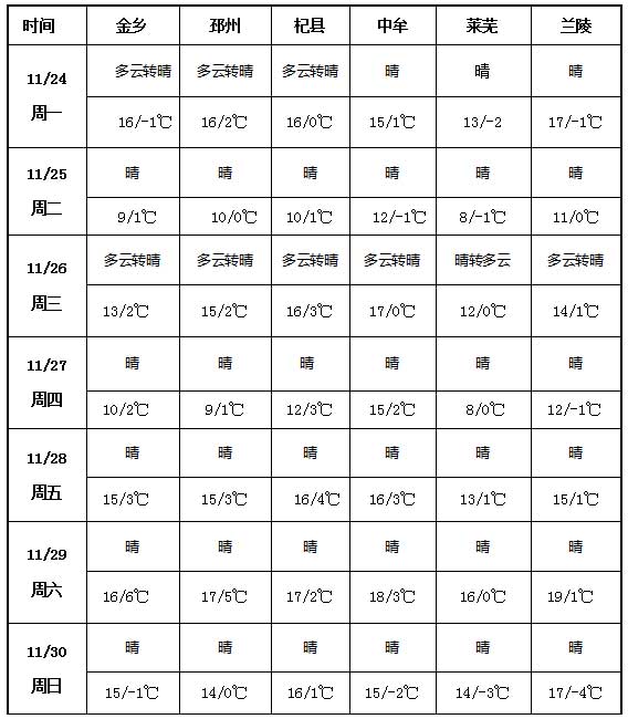 未來一周(11月24日-11月30日),金鄉(xiāng)、邳州、杞縣、中牟、萊蕪、蘭陵六大產(chǎn)區(qū)天氣以晴或多云轉(zhuǎn)晴為主,整體天氣狀況良好,周內(nèi)基本無降水。