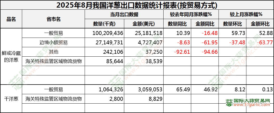 2025年9月洋蔥出口數(shù)據(jù)(按貿易方式)