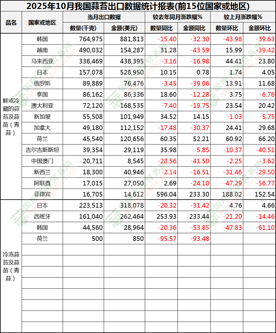 2025年10月蒜苔出口數(shù)據(jù)(按國家)