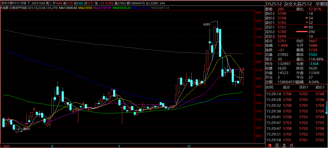 面對(duì)復(fù)雜多變的市場(chǎng),華夏國際大蒜電子盤為市場(chǎng)參與者提供了更為直觀的市場(chǎng)溫度計(jì)。從雜交大蒜2512合約的近期日K線走勢(shì)來看,正處于一種多空膠著的震蕩格局,電子盤的價(jià)格發(fā)現(xiàn)功能,在此次波動(dòng)中得到了直接體現(xiàn)。